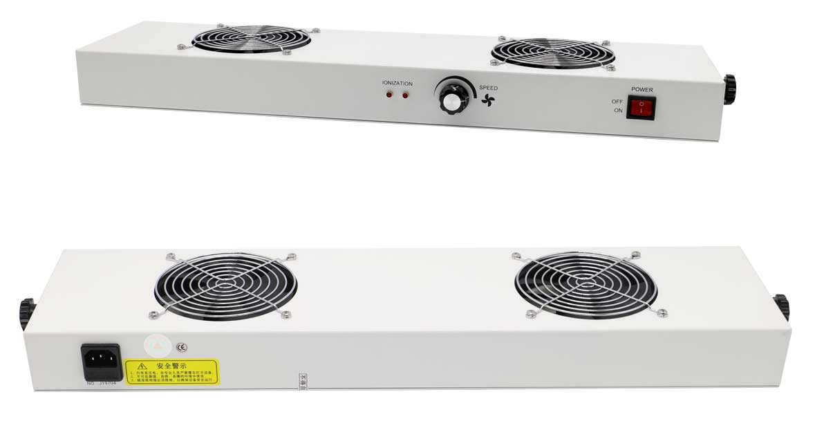 自清潔懸掛式離子風機采用正、負同步發射電極,通過直流高壓產生電暈放電,將空氣分子電離,產生大量正、負極性的空氣離子,并由風扇將其吹向被消物體表面進行靜電消除。