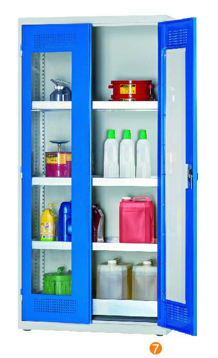 用于污染液體的存儲,可調式隔板,上下25mm可調 可移動式底部貯存盤高100mm,無縫焊接,更好防泄漏 門板的頂部及底部帶通風孔,自然通風,門開啟角度12。 隔板/貯存盤式層板每層最大承重60KG (可抽出式除外) 柜體最大承重承重:300KG