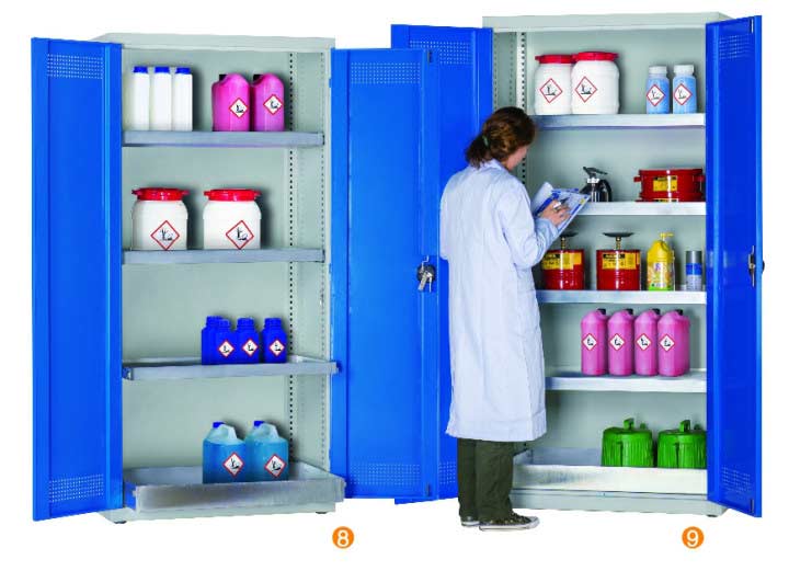 用于污染液體的存儲,可調式隔板,上下25mm可調 可移動式底部貯存盤高100mm,無縫焊接,更好防泄漏 門板的頂部及底部帶通風孔,自然通風,門開啟角度12。 隔板/貯存盤式層板每層最大承重60KG (可抽出式除外) 柜體最大承重承重:300KG